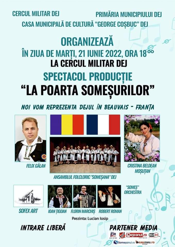 Ieri, 21 iunie 2022, de la ora 18, a avut loc un superb spectacol „LA POARTA SOMEȘURILOR”, la Cercul Militar Dej, susținut de Cristina Beldean Moșutan, Felix Gălan, Someș Orchestra Dej, Ansamblul Folcloric Someșana Dej.