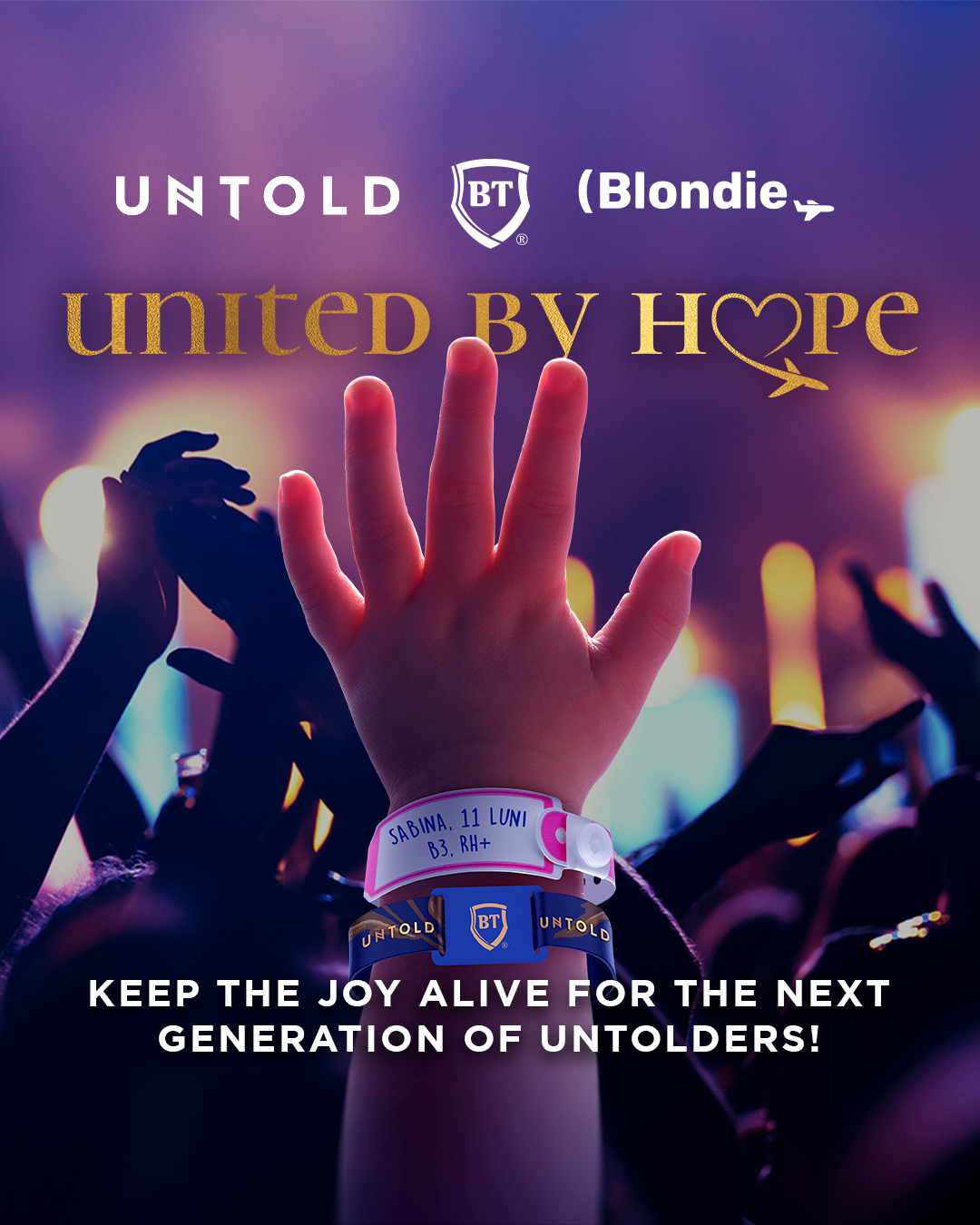 UNTOLD, unul dintre cele mai mari festivaluri de muzică din lume, și Banca Transilvania, lider în domeniul bancar din România, au lansat campania “United by Hope”, pentru a sprijini Asociația Blondie în acoperirea costurilor pentru zborurile medicale esențiale ale copiilor grav bolnavi.